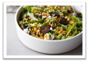 Dans un grand bol, fouetter le jus de citron, le vinaigre de vin rouge, l’huile d’olive, l’échalote, la moutarde, le sel, le poivre et le curcuma. Ajouter le farro, les figues, la roquette et bien mélanger. Émietter le féta et remuer à nouveau.